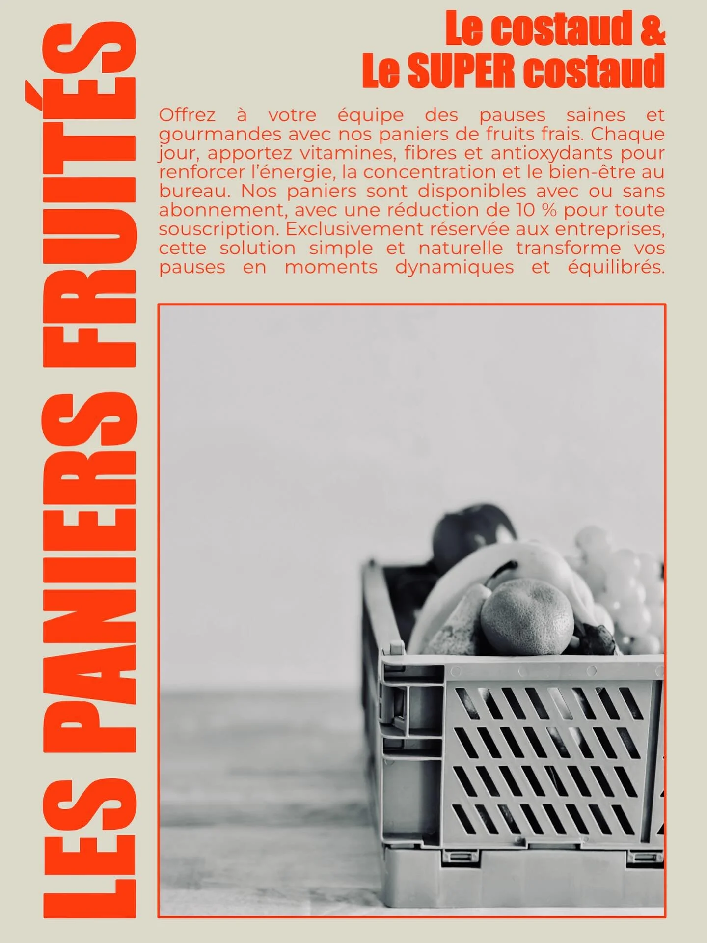 Découvrez nos paniers de fruits, une solution idéale pour allier bien-être et gourmandise au bureau. Avec nos deux offres, Le Costaud et Le SUPER Costaud, profitez chaque jour d’un apport naturel en vitamines, fibres et antioxydants essentiels pour renforcer votre énergie, votre concentration et votre système immunitaire. Les fruits frais favorisent une meilleure digestion, réduisent la fatigue et apportent une sensation de satiété saine, évitant ainsi les baisses de régime en cours de journée. Offrez à votre équipe une pause vitaminée et savoureuse, pour un quotidien plus équilibré et dynamique